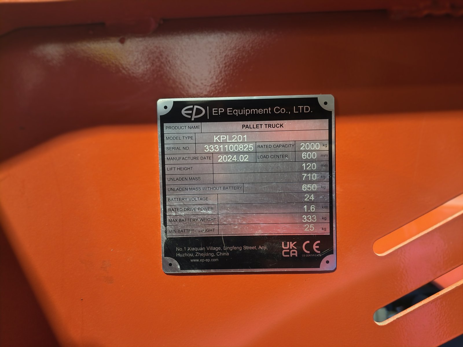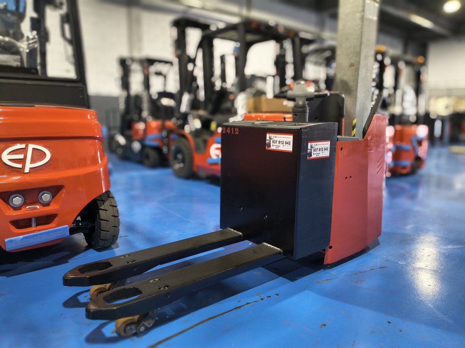 Transpaleta eléctrica EP 2000 kg Li-ion. Modelo 3331100825. Año 2024. Batería 24V 205Ah Li-ion. Cargador 100Ah externo monofásico. Garantía 6 meses.